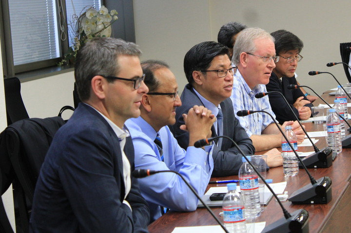 つづいて、意見交換会の場が設けられ、九州大学側からの話題提供として、三浦教授、清水教授、康副研究院長、鴨打教授が、それぞれ自身の研究内容についてスライドを交えて説明されました。イリノイ大学の各教授からも多くの質問やご意見を頂き、活発な意見交換会となりました。
