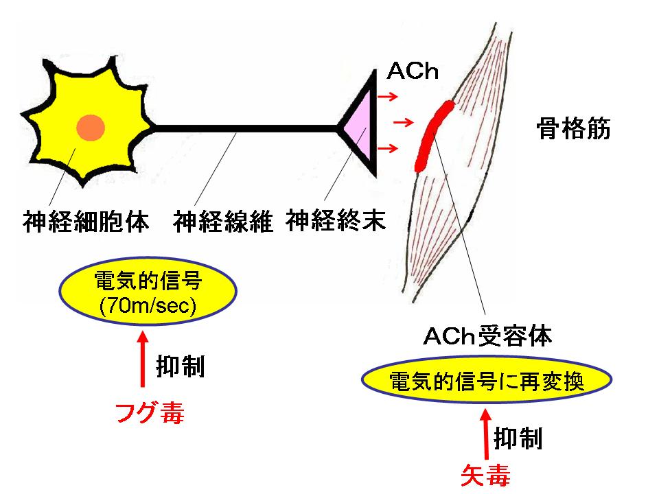 <イラスト説明> フグ毒は神経の電気的信号が伝わるのを妨害し、矢毒はACh(アセチルコリン)受容体をふさいでしまう。